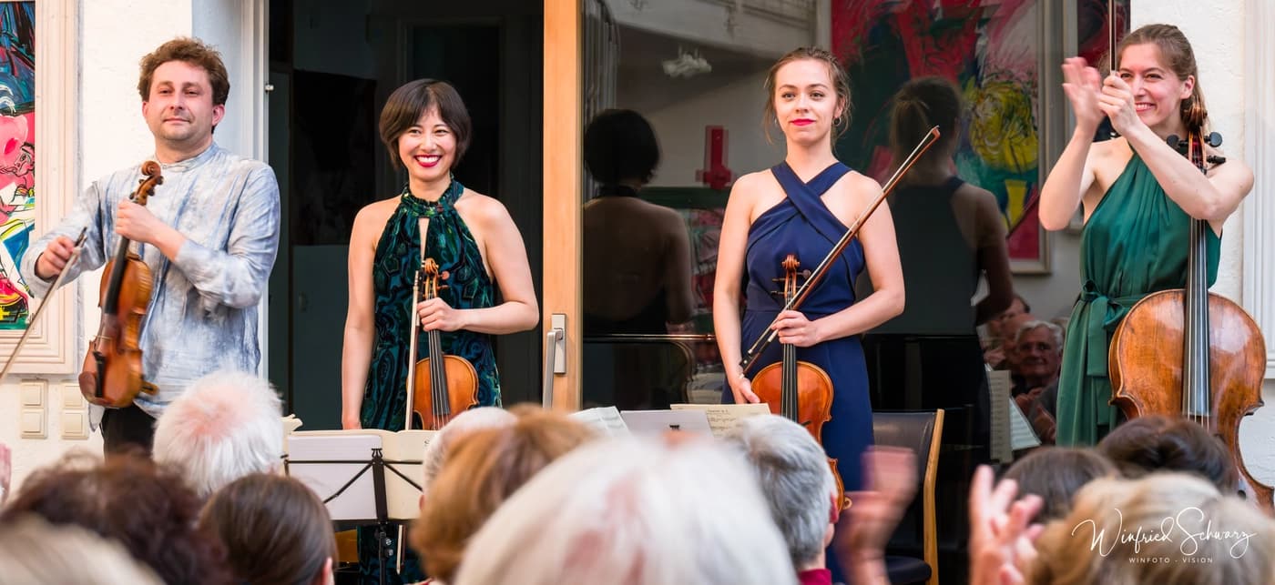 Vom Frankfurter Malion-Quarett hörte man eine meisterhafte Interpretation dieses komplexen Werkes. Alex Jussow (Violine, als Solist bereits bekannt in der Stiftung), Miki Nagahara (Violine), Lilya Tyrnchsyhyn (Viola) und Bettina Kessler (Cello) rissen das Publikum im vollen Haus zu Beifalls-Stürmen hin, die durch kostbare Zugaben belohnt wurden: zwei Fugen von Johann Sebastian Bach aus dem Wohltemperierten Klavier (Band II), bearbeitet von Wolfgang Amadeus Mozart. Nach der Dramatik und der kontrastreichen Spannung bei Schubert öffnete sich nun das Tor zur Ewigkeit. Hörte man ein bedächtiges Zirkulieren jenseits von Zeit und Raum. Diese Töne wollten nirgendwo hin, sie hatten es geschafft, ruhten ganz in sich.